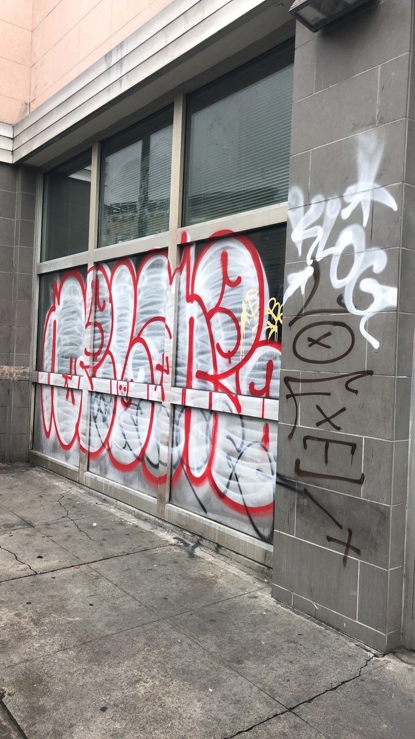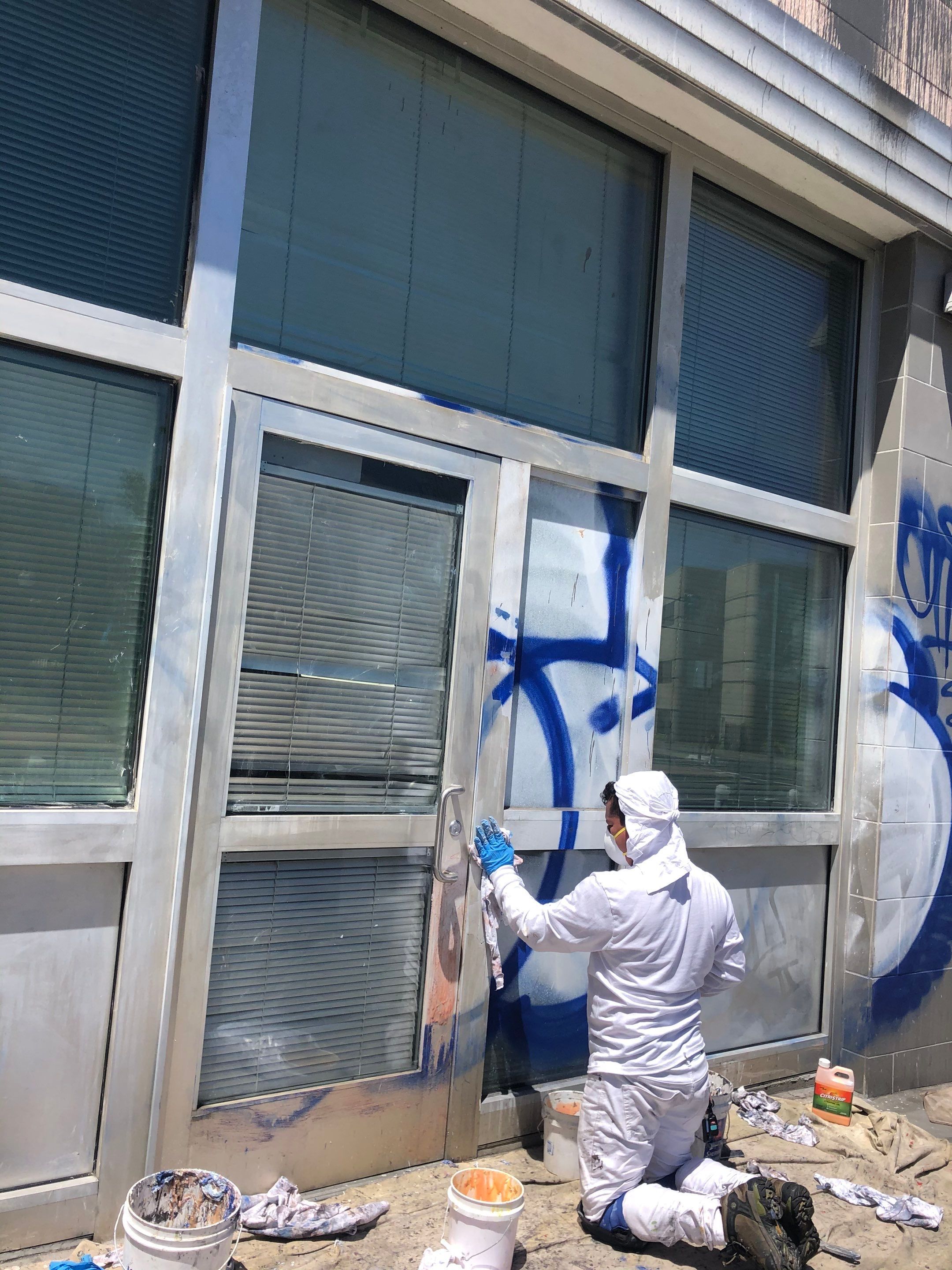 The process varies depending on the surface, but the first step for this project was a graffiti removal product to dissolve the unwanted paint. Every surface reacts differently to chemicals and paint, in some areas the removing part took more time.